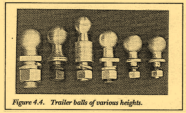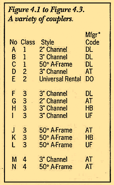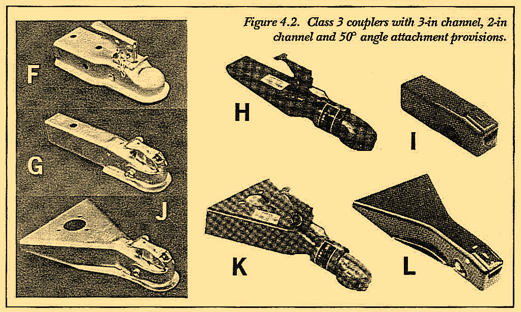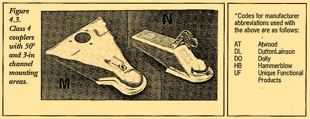 The coupler on the trailer fits over the ball on the hitch which is permanently attached to the tow vehicle. The coupler (Figures 4.1 to 4.3) is often incorrectly referred to as a hitch and clarification is usually in order for most conversations. Couplers, like hitches, are manufactured in four weight classifications, generally accepted as standard today, which are: