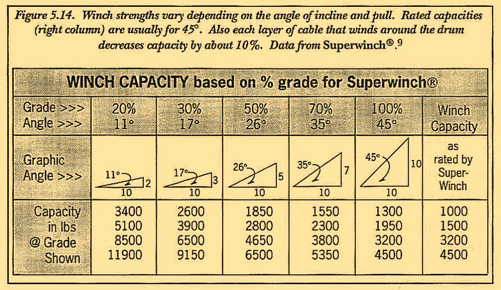 To give you an idea of a winch’s capacity, the chart in Figure 5.14 was prepared. The change in capacity of the load being hoisted with respect to the angle of incline is listed. This chart is applicable only to free rolling vehicles or boats riding over rollers. A damaged or wrecked auto will create a lot of resistance as it’s metal scrapes and gouges its path. The ease of moving non-rolling cargoes depends on the coefficient of friction between the two surfaces. As you can see, from Figure 5.14, though, the ability of the winch to pull decreases as the angle increases.