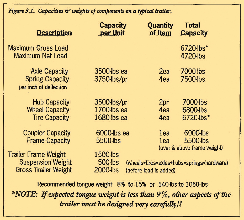 Still, your end result may not be perfectly coordinated as to capacity. One part will always be weaker or stronger in relation to some other part. Listing the different components and their separate capacities will provide some insight regarding this puzzle. At first, the trailer’s true capacity appears difficult to assess. Finding the weakest link can be confusing since different components support different things. The true capacity may well be the weakest link. But just what is the weakest link?