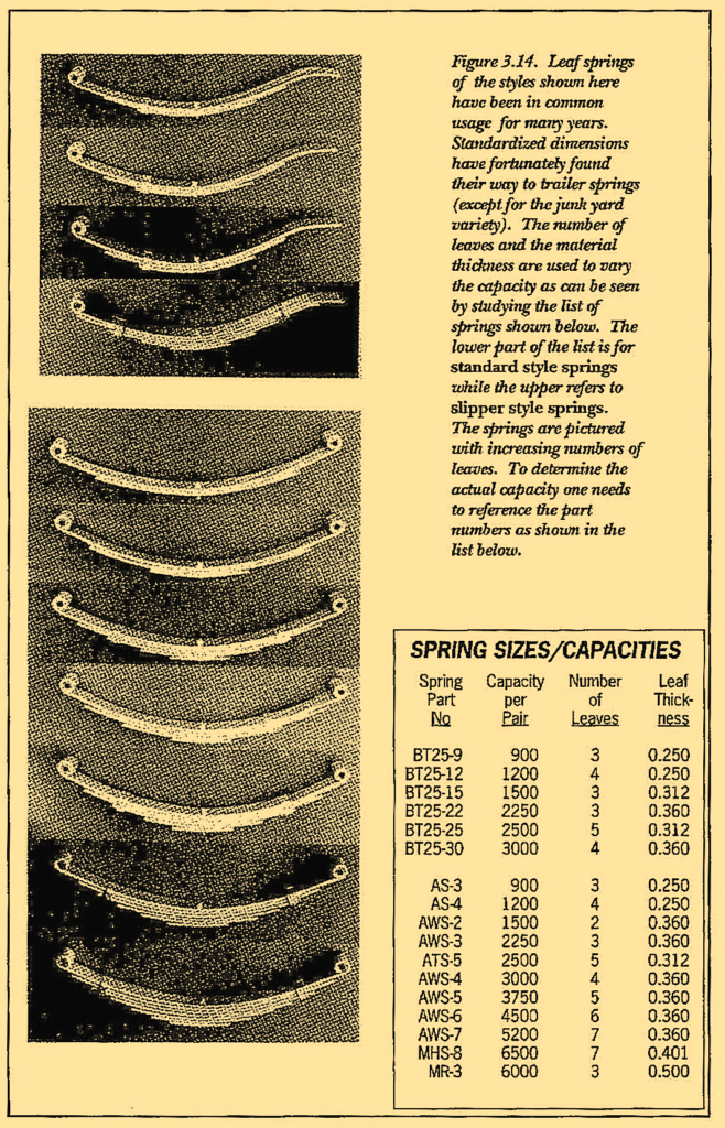 Selecting the correct springs is much easier if you know something about shapes, capacities, dimensions, what’s on the market and what works best where. A chart of typical spring capacities and their corresponding sizes is also shown in Figure 3.14. Except for very large capacities, the width for most trailer springs is 1-3/4-in. Standard two-eye springs have an eye to eye dimension of 26-in while the slipper is designed for an overall of about 25-in with the slipper length about 3-in to 4-in long, as the figure shows. Capacities of leaf springs are varied by changing the thickness of the material and the number of leaves, while retaining the same basic dimensions. These standardized dimensions certainly simplify installation.