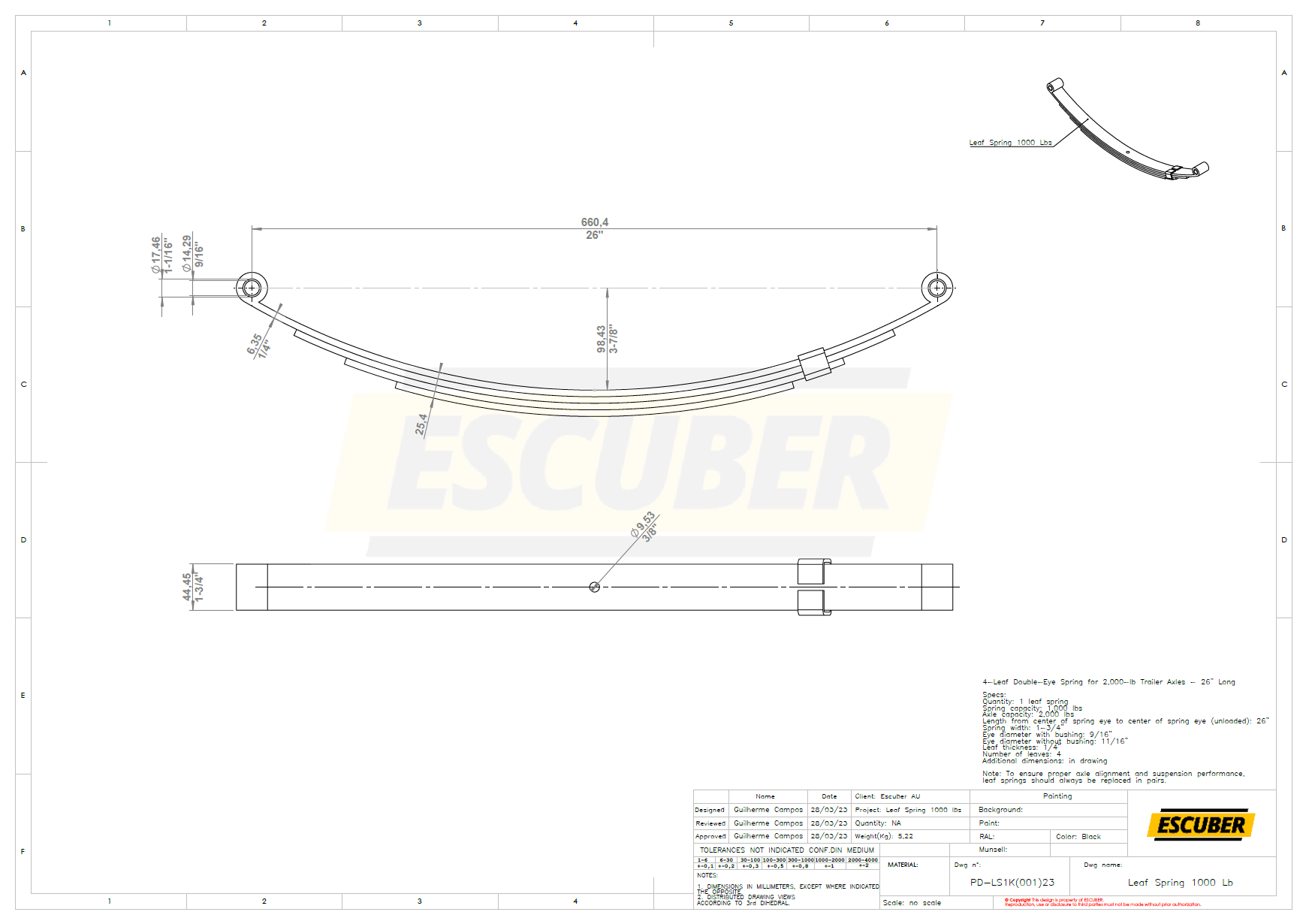 Double-eye leaf spring acts as part of a trailer’s suspension system by providing an attachment point for a 2,000-lb axle. Spring flexes to resist shock and also ensures a smooth ride. Includes bushings with 9/16″ inner diameter.