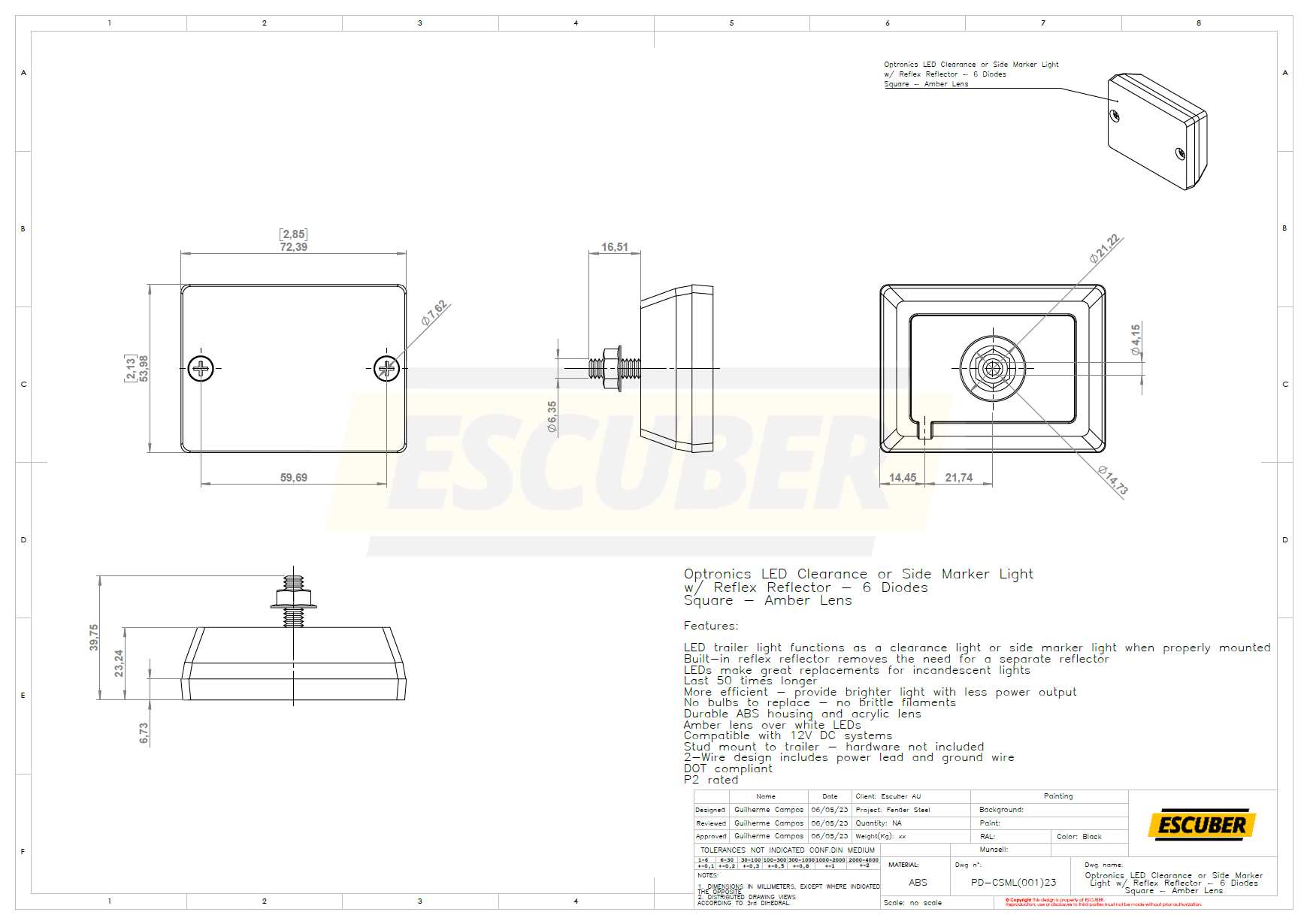 2-7/8″ x 2-1/8″ Square. LED trailer light functions as a clearance or side marker light when properly mounted. Built-in reflex reflector. Durable ABS housing with black base. Surface mount – hardware not included. 2-Wire design. P2 rated.