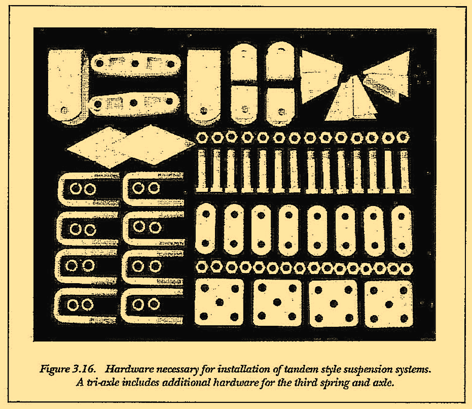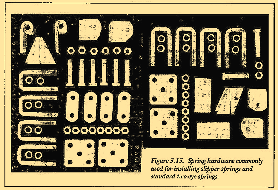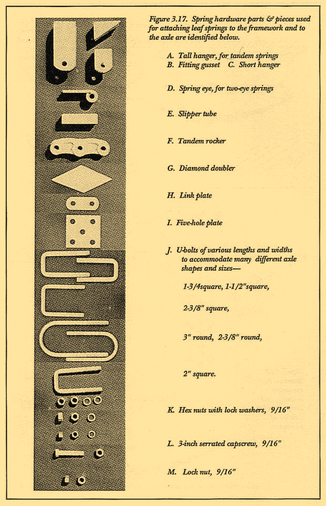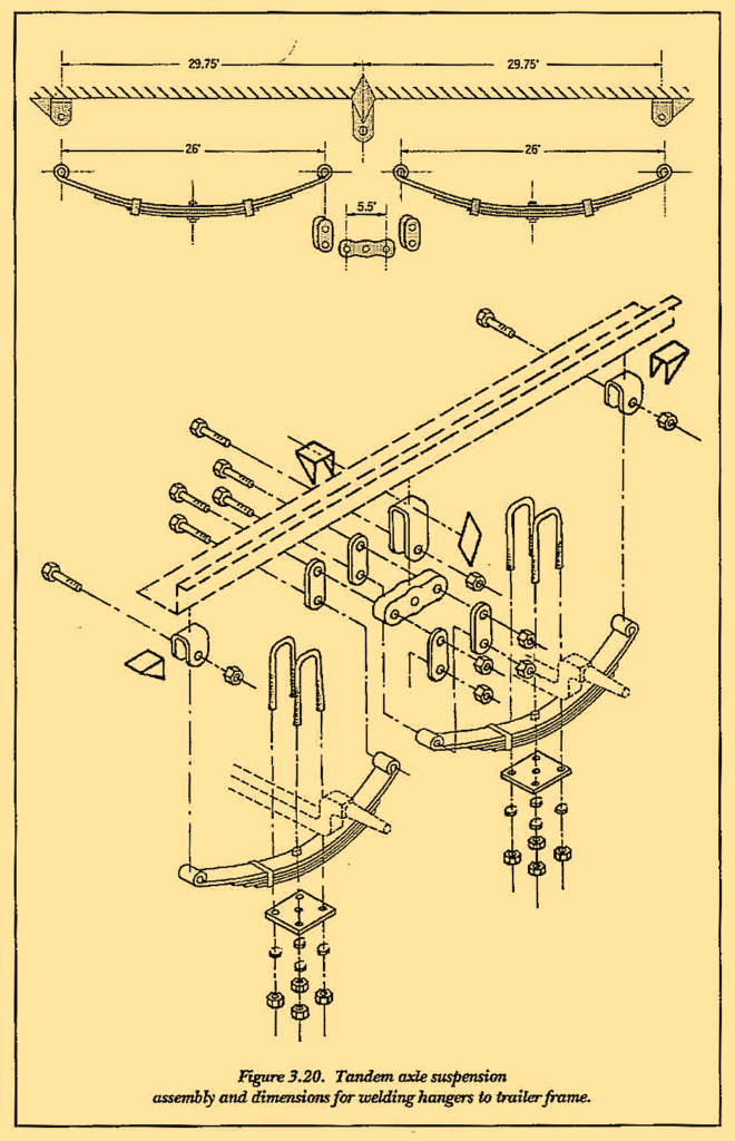 Springs are useless without a way to attach them to the frame and the axle. The hardware shown in Figures 3.15 through 3.17 are typical of the variety of parts needed to accomplish this task. Figure 3.17 will help you identify and name each of the individual parts. Figure 3.18 through 3.20 illustrate the standard assembly order and dimensions for the three most common leaf spring configurations-single axle slipper, single axle two-eye, tandem axle two-eye springs. Notice that only a few parts are welded to the trailer frame while the rest are bolted in place. Springs themselves are always bolted, never welded. Springs are a highly heat treated special formula steel whose properties remain intact unless embrittled with heat from a weld. Welded spring steel will fatigue and crack from only a small number of load cycles-probably your first trip out. So please don’t weld springs. (Sorry about the lecture, but I have seen springs welded.)