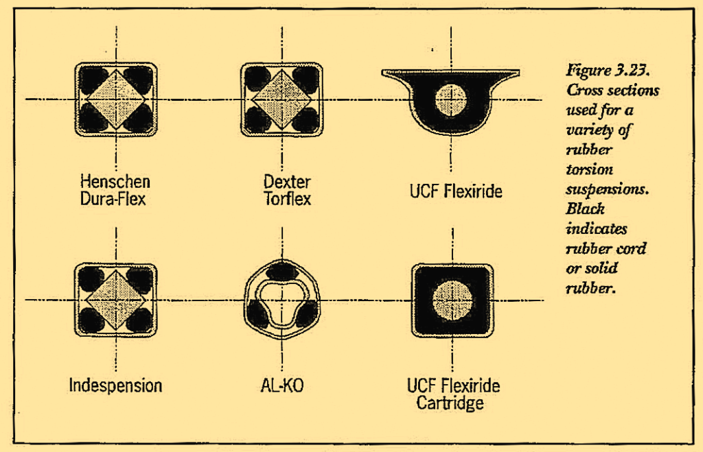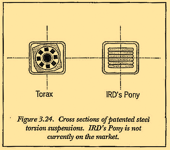 Steel torsion suspensions are more expensive but can eliminate some of the disagreeableness of the rubber. Steel does not deteriorate with age or from chemicals (diesel fuel, animal wastes. . .). It also bends in a more predictable manner and only in the direction permitted. Cross sections for two known styles are shown in Figure 3.24. Currently only the Torax is on the market; however, by the time you read this book both may be and searching out the whereabouts may be worthwhile time spent.