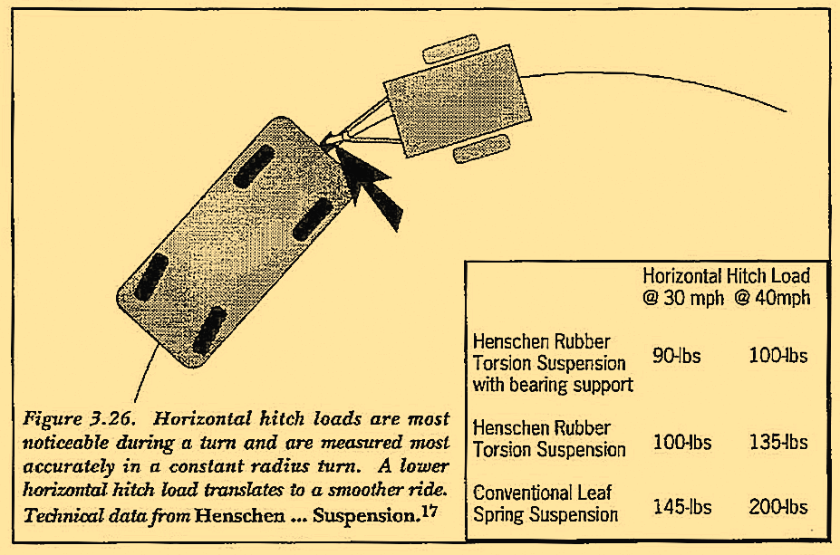 However, some of the claims made by torsion suspension proponents have been substantiated with the use of an independent testing lab. A smoother ride, as detected by the tow vehicle, results when the longitudinal and horizontal loads at the hitch are lower. The Henschen axle was tested to determine longitudinal and horizontal hitch loads in comparison to loads from a trailer using the standard leaf spring suspension.